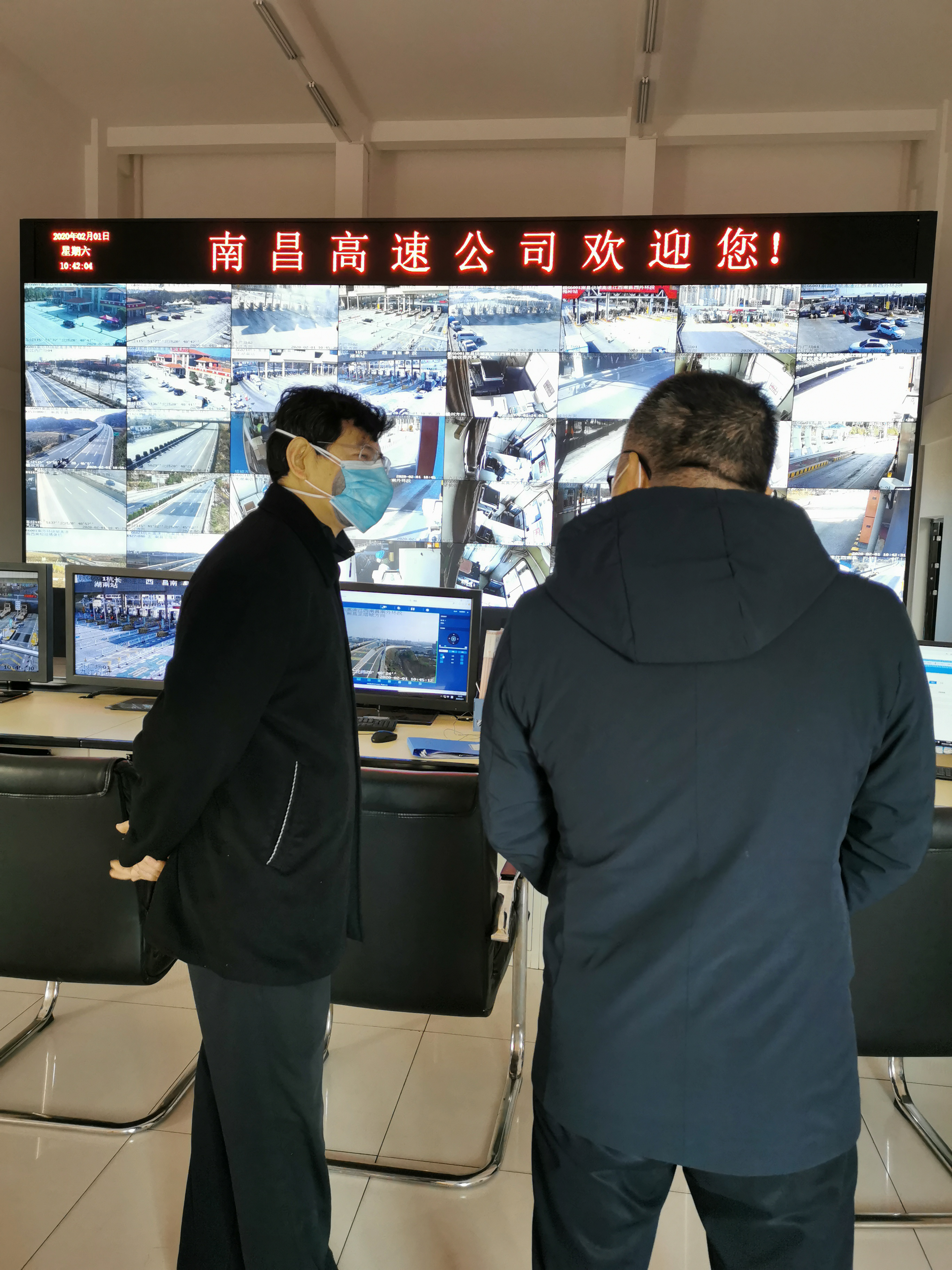 何志敏在高速公司副总经理杜宏伟和工会主席葛雯的陪同下,依次来到高速监控中心、九龙湖南收费站和赣江服务区检查中,他再次强调,“疫情就是命令,防控就是责任",我们一定要坚守岗位、众志成城,共克时艰,全力维护人民群众生命安全和身体健康,坚决打赢疫情防控阻击战。同时他还要求大家合理安排值守作息,做好自身的防护防疫,为全市的防疫工作做出贡献。