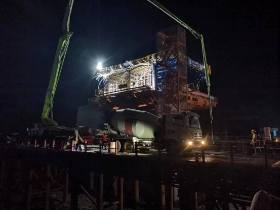 据项目负责人介绍,此次浇筑完成的标段最大跨度60+2*90+60米连续箱梁右幅83号主墩0号块,长12米、高5.5米,宽16.55米,混凝土使用方量为433.6立方米,采用支架现浇的施工工艺,施工过程中存在浇筑难度大、施工时间长、安全风险高等情况。该连续梁“0号块”顺利浇筑完成,标志着东阳特大桥转入上部结构施工阶段。为了确保此次连续梁0号块顺利浇筑,在南昌市建投集团的统一部署下,施工单位精心组织,多次进行施工技术交底,明确从支架搭设到模板安装、钢筋帮扎等各个工序、环节的技术规程和操作规范,确保浇筑过程中的安全质量有序可控。